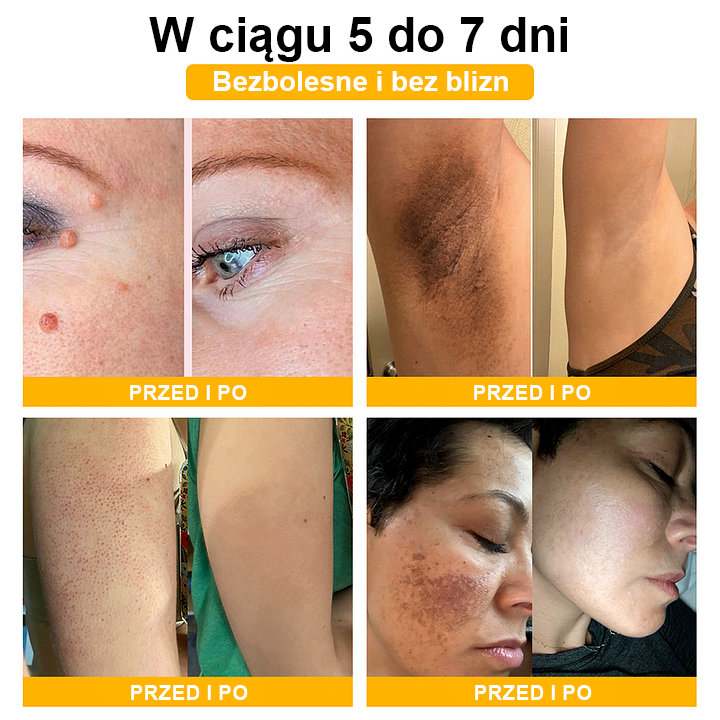 Całkowicie usuwa wszystkie rodzaje brodawek i znamion w ciągu zaledwie 1-2 tygodni.